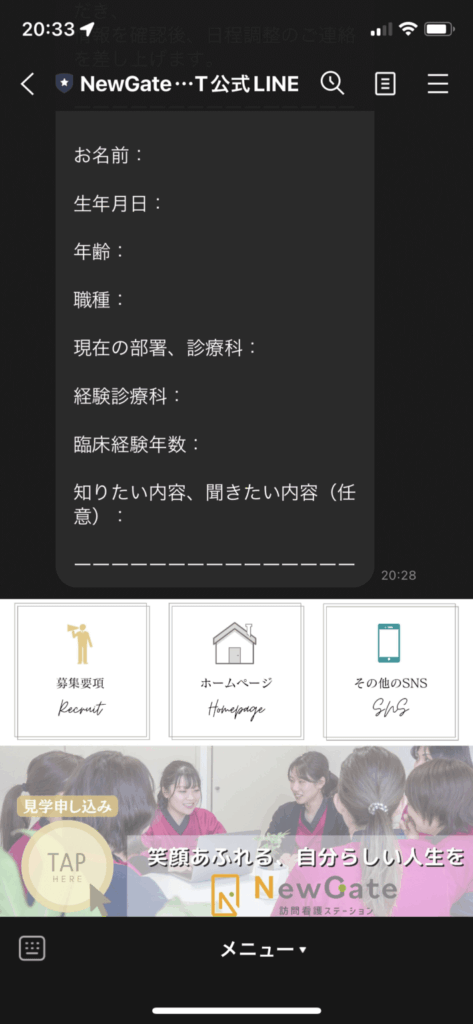 公式ラインでは主にスタッフの採用に関する情報を受け取ることができます。
